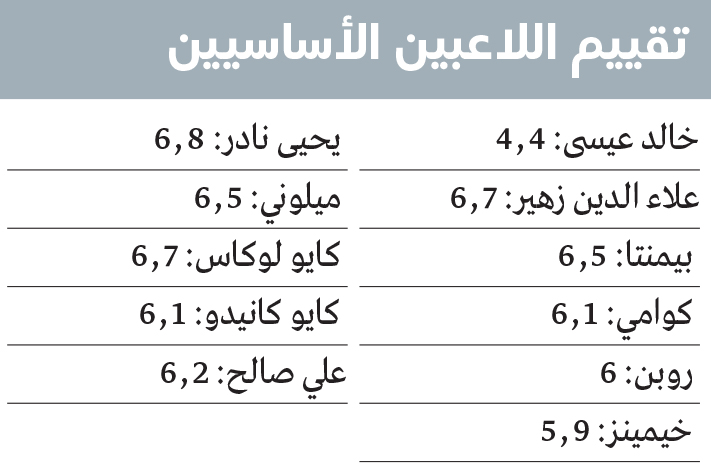 في حين سجل خالد عيسى رقماً مميزاً خلال ظهوره في مباراة عُمان الأولى بملحق التصفيات قدّره الموقع بـ7.2 بعدما تصدى بشكل مميز لأكثر من لعبة كانت حاسمة في توجيه النتيجة لمصلحة الأبيض الذي فاز 2-1.
