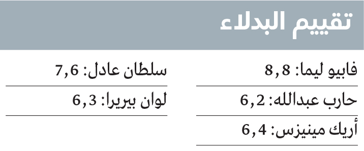 وحصل أكثر من لاعب بديل ممن شارك في الشوط الثاني بمباراة قطر على تقييمات أعلى من التي حصل عليها اللاعبون الأساسيّون، فنال فابيو ليما 8.8، في حين حصل سلطان عادل، الذي سجل هدف الأبيض الوحيد على 7.6.